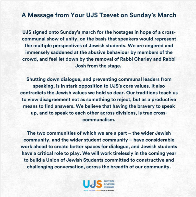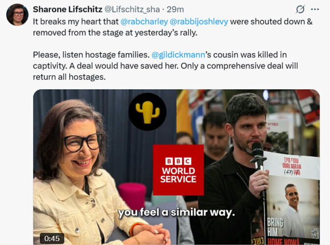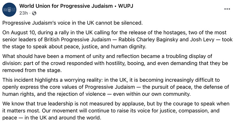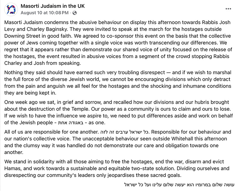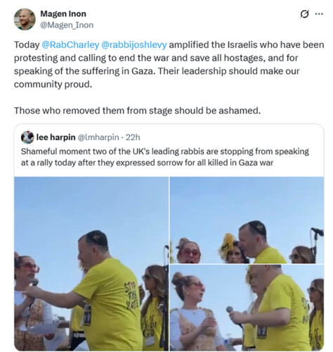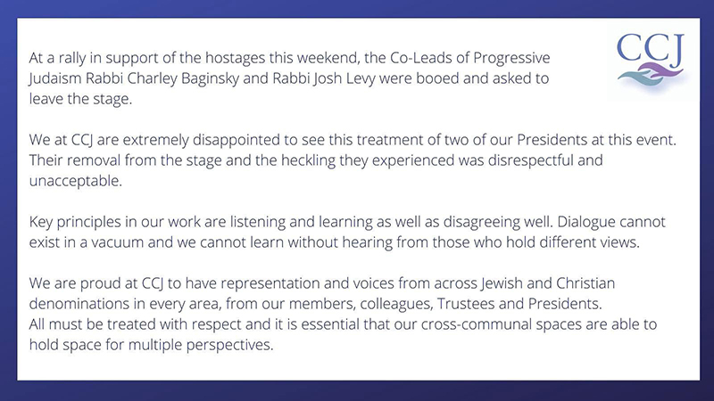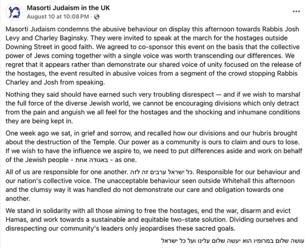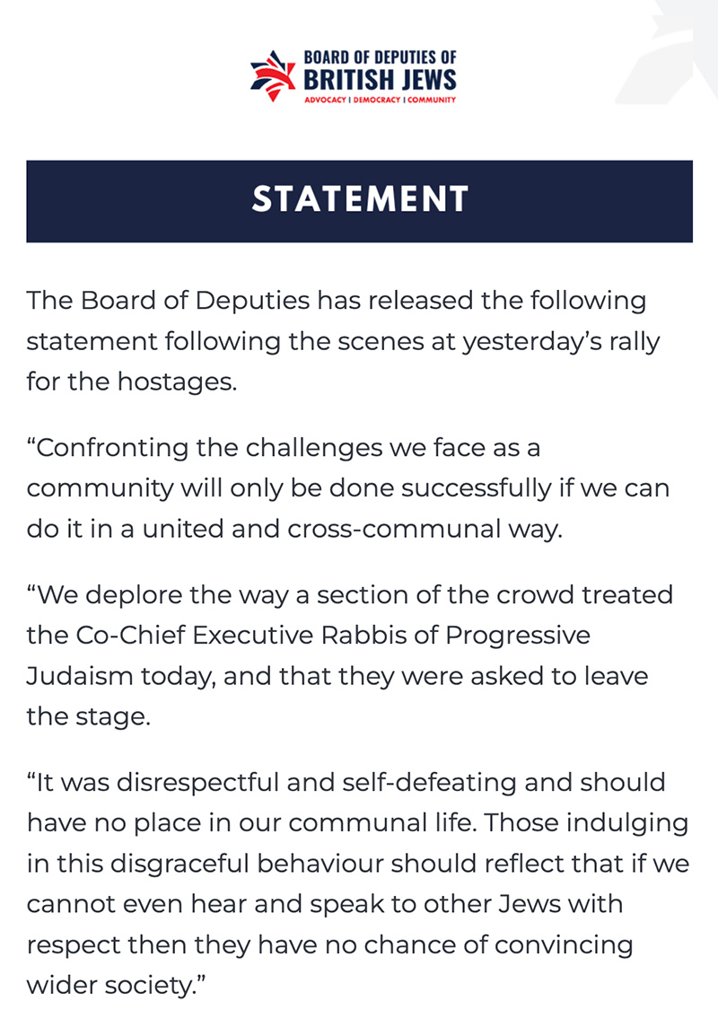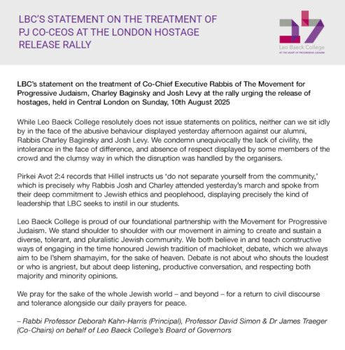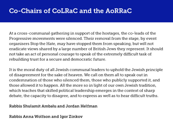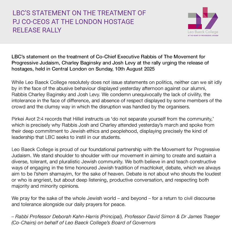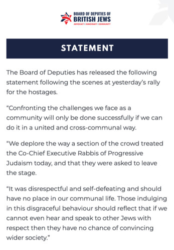 At Sunday’s cross-communal rally for the hostages, Rabbis Charley Baginsky and Josh Levy, Co-Leads of Progressive Judaism, were invited to speak. Although the rally was organised by Stop the Hate and supported by national Jewish bodies, we were assured it was about the hostages, and that our presence was both agreed and welcome. When our rabbis began to speak, parts of the crowd booed. Before they could finish, they were forcibly removed from the stage, despite having shared remarks in advance, fully in line with what is said at weekly hostage rallies in Israel.